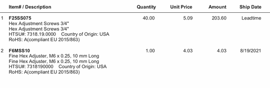 Total Cost of Items |