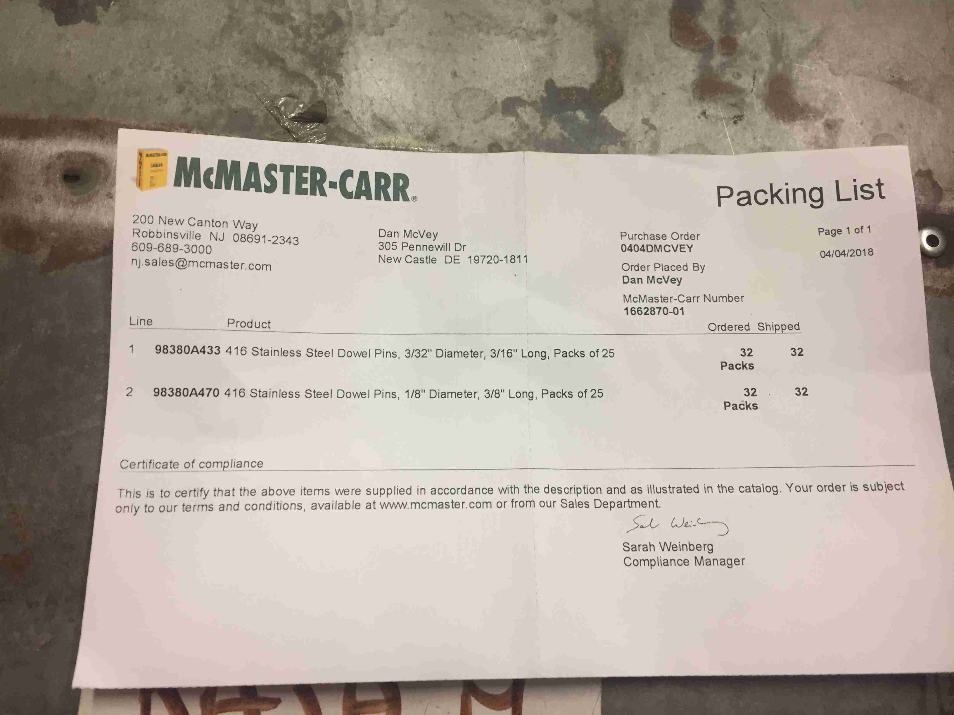 McMaster Carr Dowel Pin